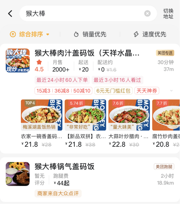 在美团外卖的长沙「猴大棒肉汁盖码饭」相关店铺页面,评分4.5分,月售超过2000单,最多的评价是「非常好吃」和「量大美味」。